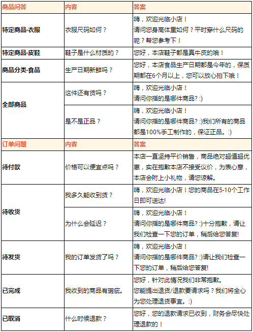 ③设置有关不同订单状态询问的常见问题,如待付款、待出货、待收货等。