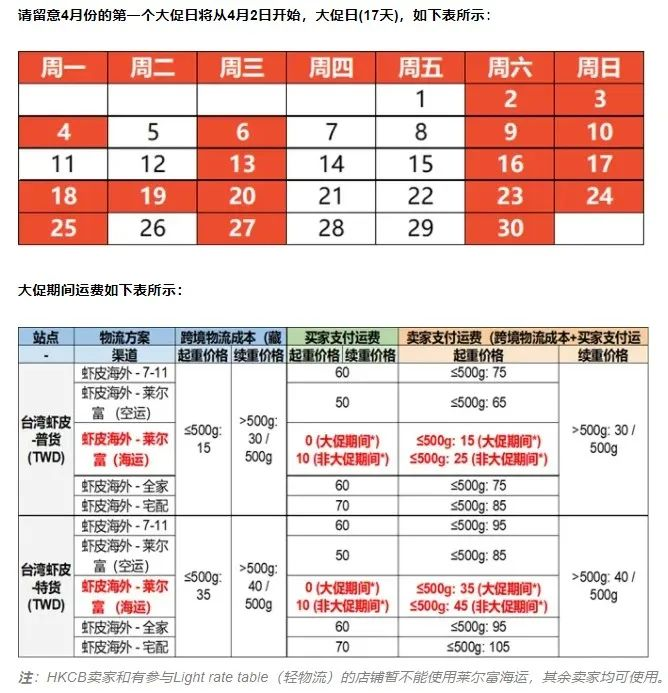 Shopee近日发布通知称,为鼓励买家在大促期间下单,进一步提升卖家销量,台湾站点使用莱尔富(海运)渠道的买家,4月的大促日将可享受包邮政策。在4月份的所有大促日,使用该渠道的买家支付运费为0 TWD,而在非大促日使用该渠道的买家支付运费为10TWD。
